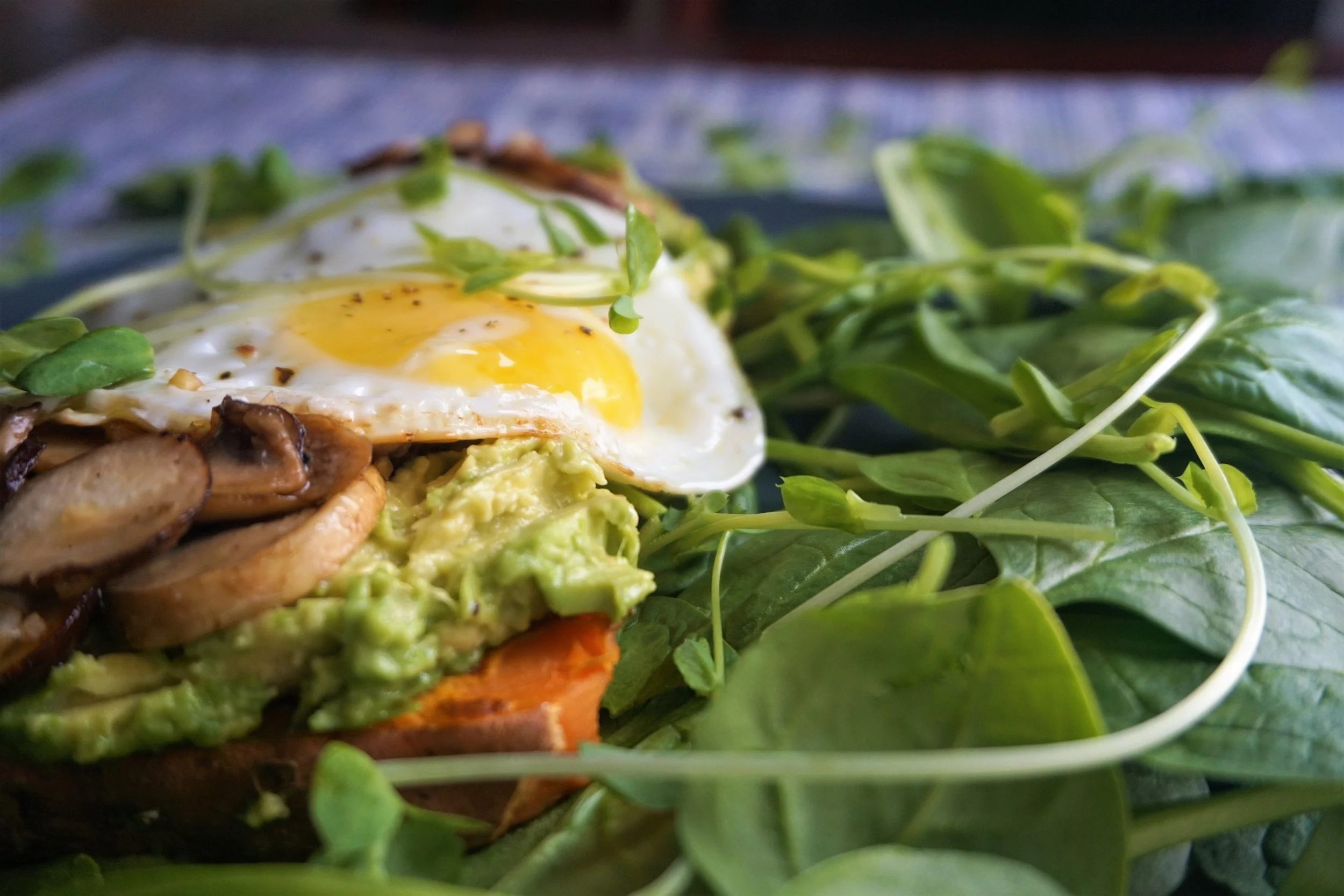 Mash avocado in a small bowl and spread on the cooked sweet potato slices. Top with sautéed garlic, mushrooms, and the egg.