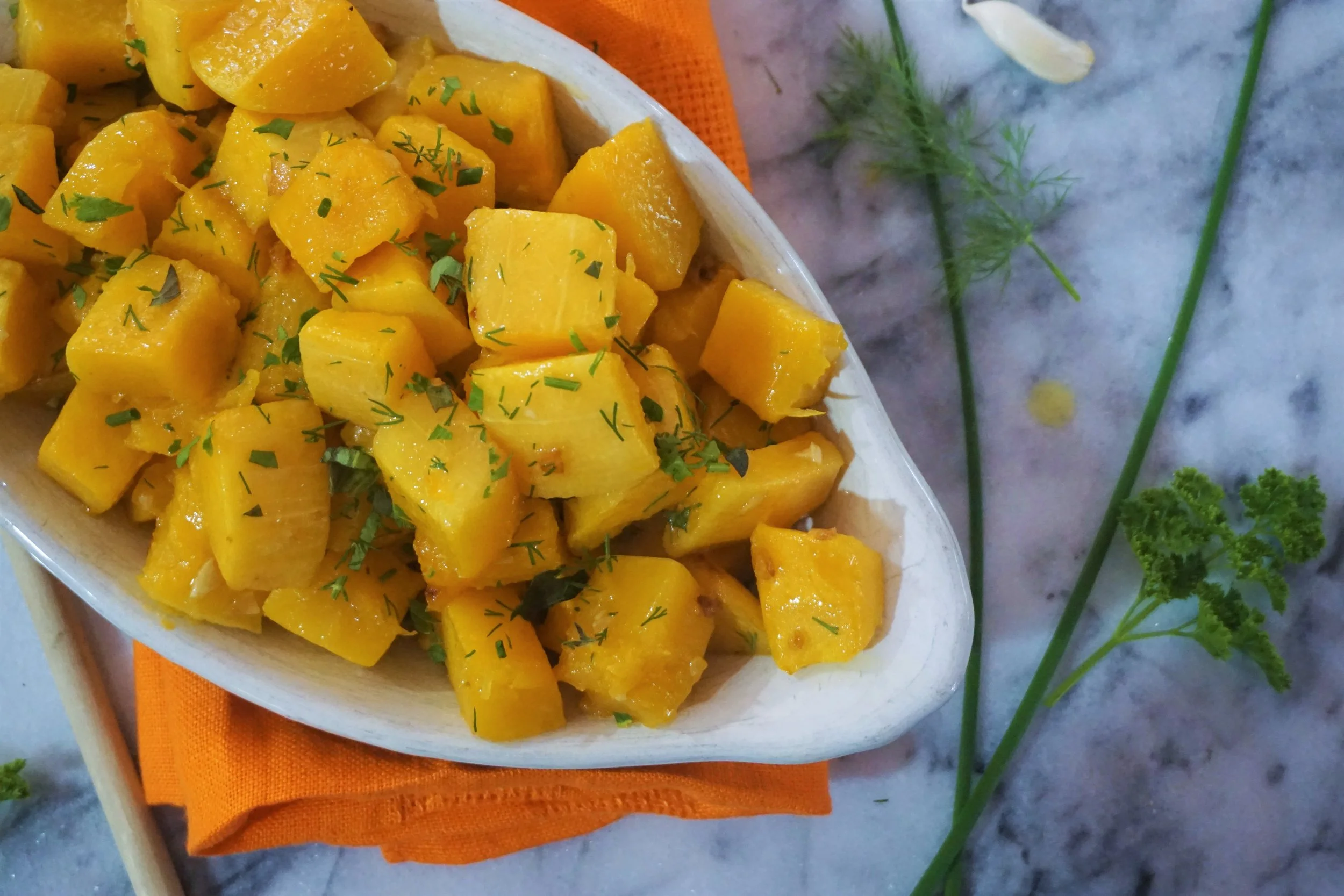 Chop up the squash into relatively even sized pieces and mix with olive oil and garlic - that's it for prep! Butternut Squash has loads of potassium, vitamin C, and vitamin E, which keeps your skin and hair healthy and glowing. Visit this website if you want to learn more about the benefits of butternut squash.